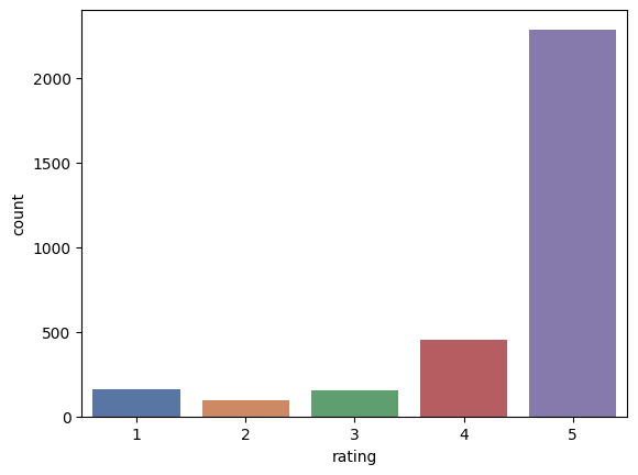 sns.countplot(x='rating', data=alexa_df, palette='deep')