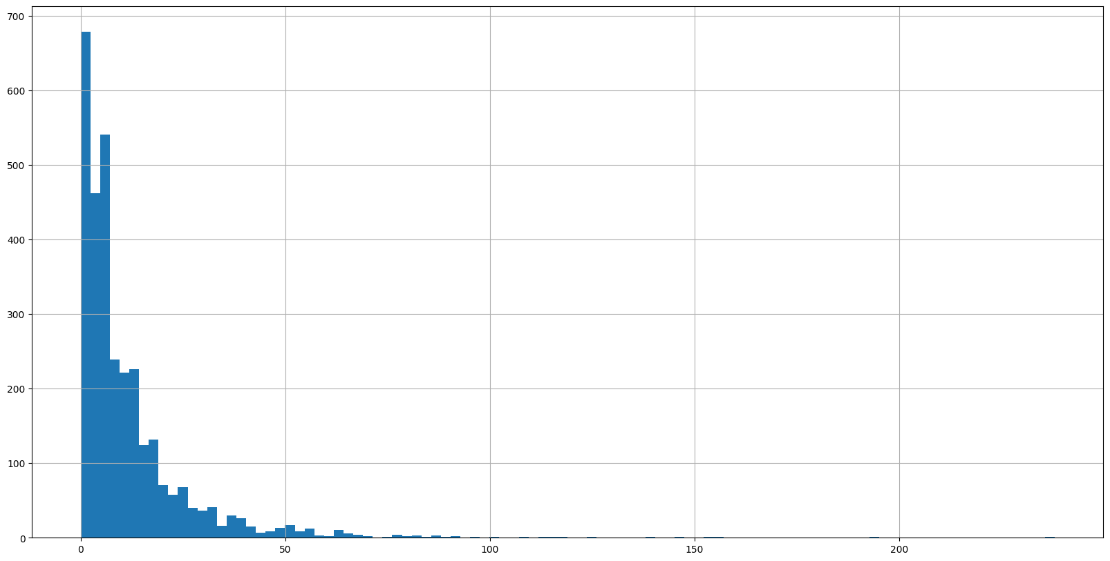 alexa_df['length'].hist(bins=100, figsize=(20, 10))