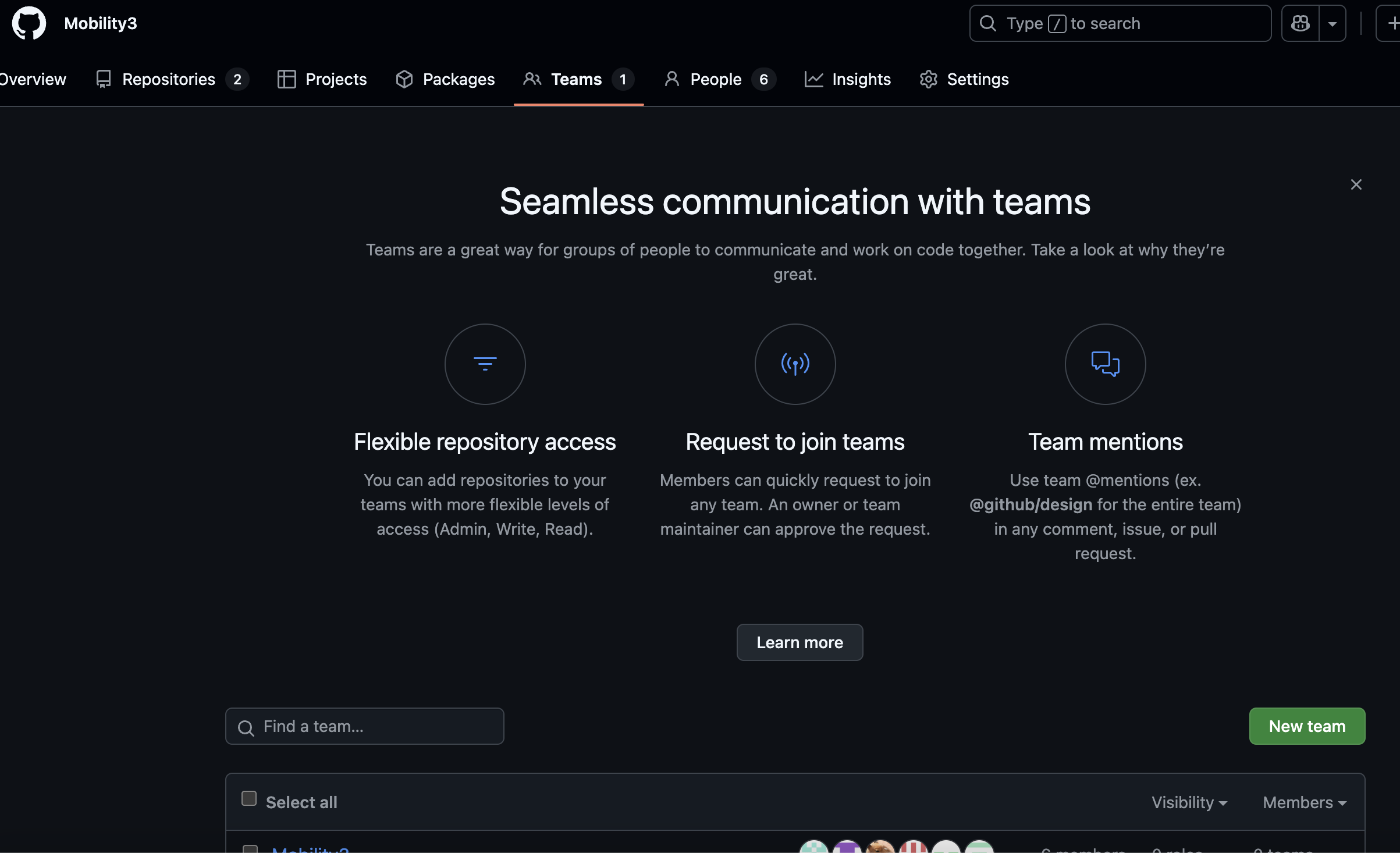 디폴트 값으로 팀들은 owner가 만든 레포를 다 볼 수 있습니다.