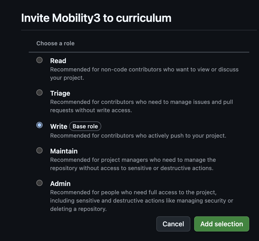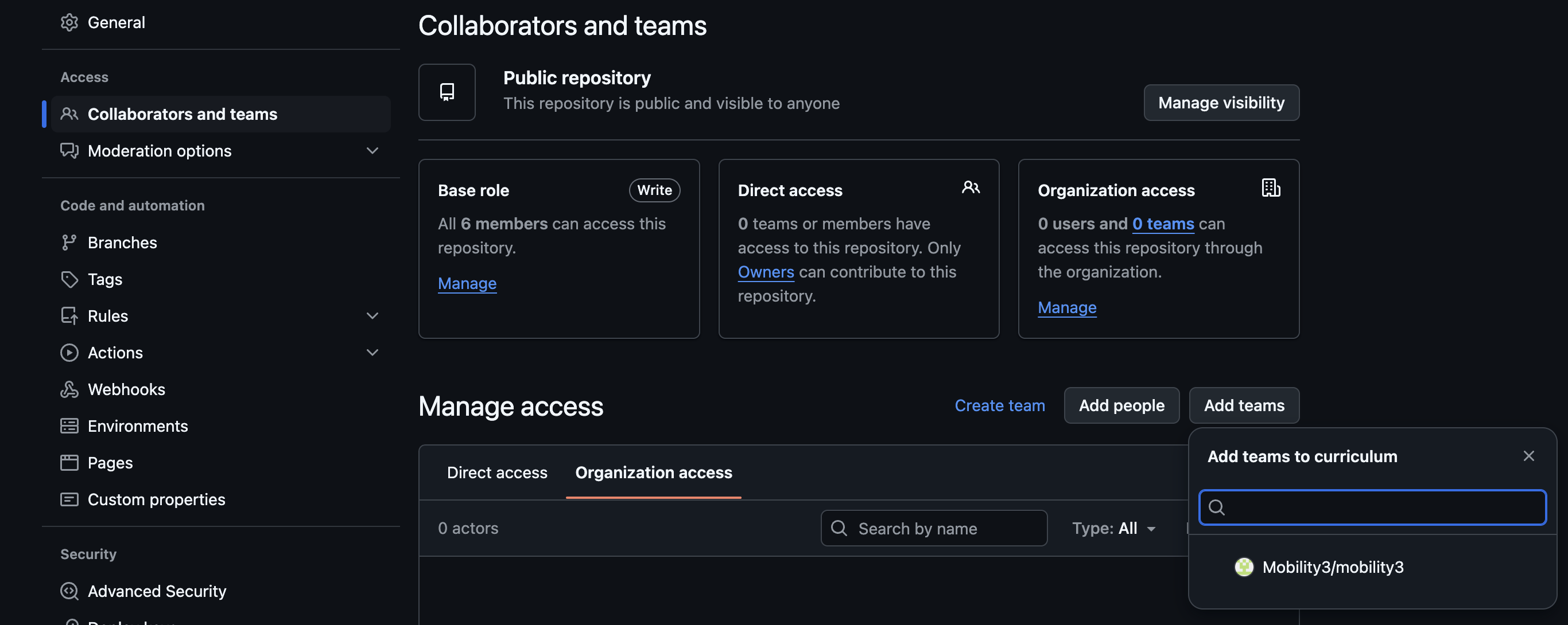 collaborator and teams 에 들어가셔서 add teams 혹은 add people후 권한 주고 싶은 팀/ 유저 선택