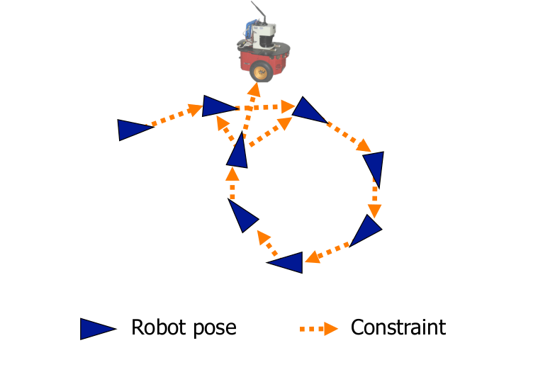 Pose graph SLAM은 로봇의 시간별 이동 위치(Pose)를 그래프 노드(Node)로 저장하는 방식이다. 이동한 위치(거리&방향) 간의 관계는 그래프의 엣지(edge)로 저장된다.