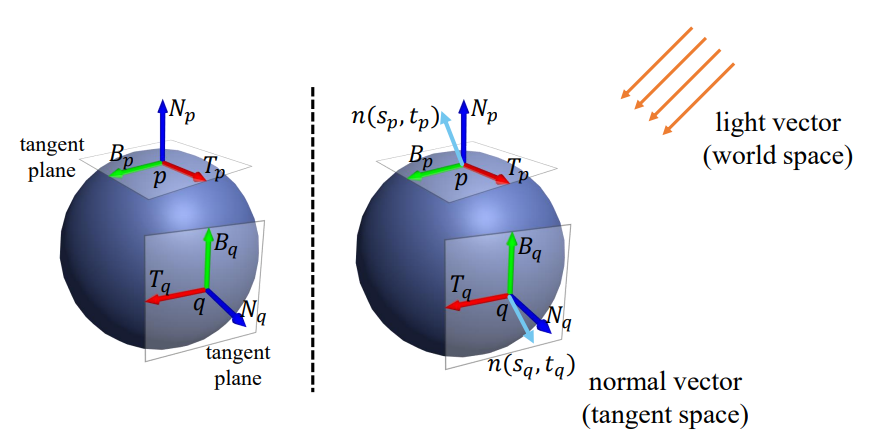 - normal map의 normal n(sq,tq)은 q의 texture coordinates (sq,tq)를 이용한다.