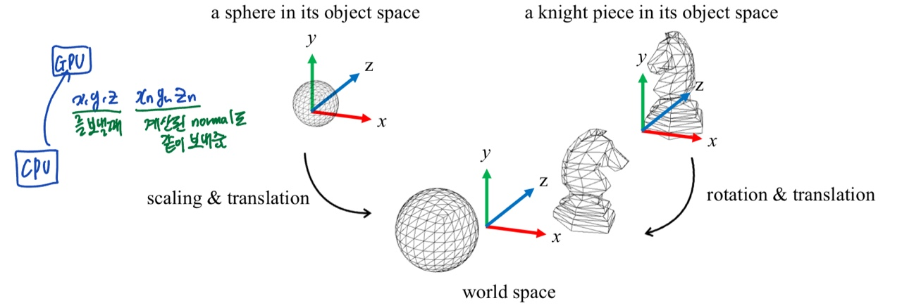 - 오브젝트 각각의 object space에 정의되어있는 것들을 world space로 옮겨준다.