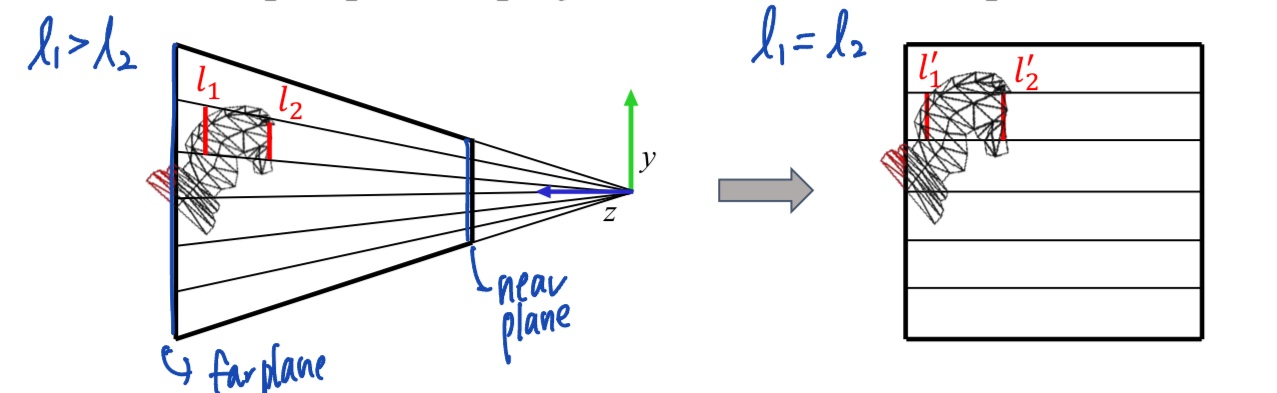 - view frustum을 원점을 중심으로 하는 axis-aligned cube에 다시 위치시킨다.