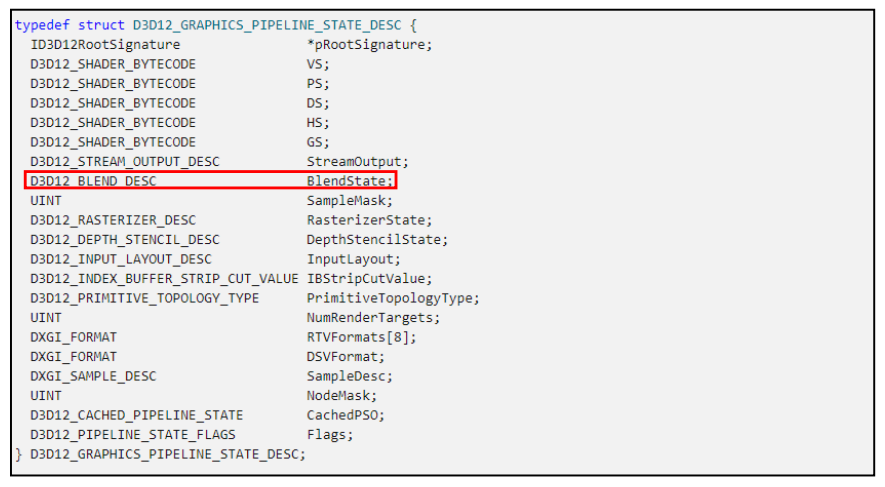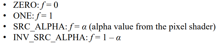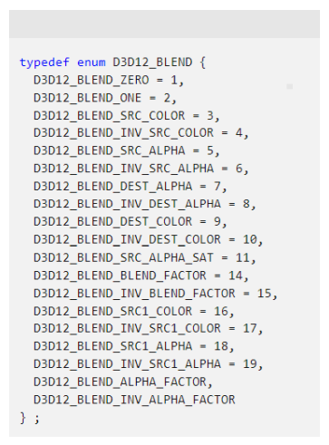 - Source blend factor = D3D12_BLEND_SRC_ALPHA