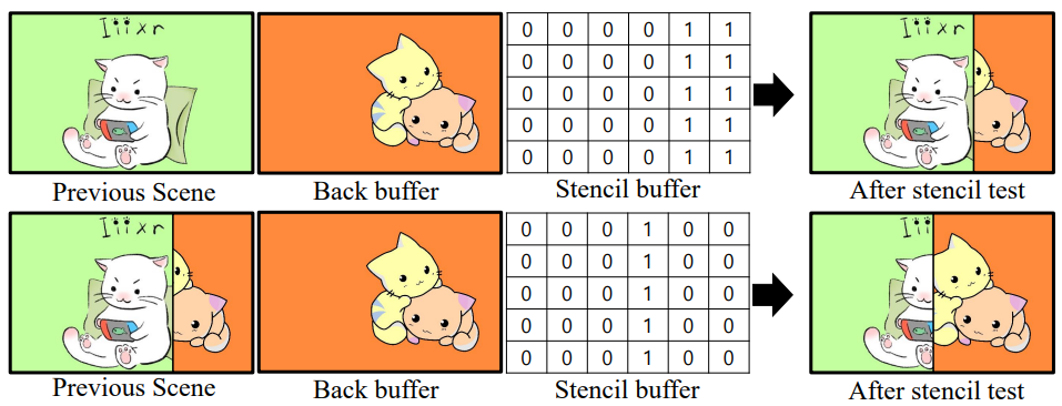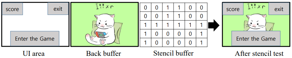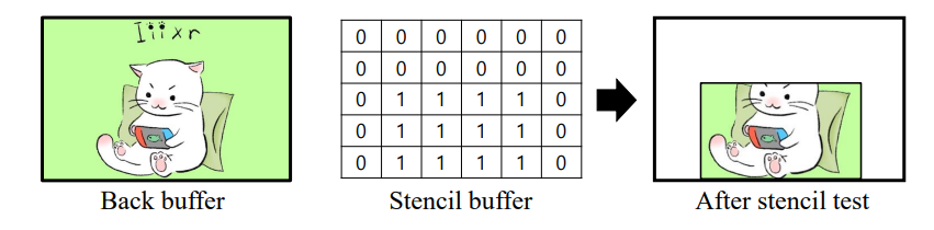 = stencil buffer 값이 1인 pixel만 back buffer로 채운다.
