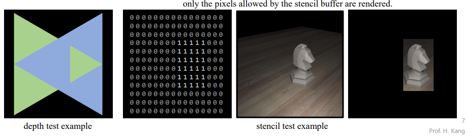 = pixel의 color와 depth value가 color buffer와 depth buffer를 update- pixel depth > stored depth value : invisible