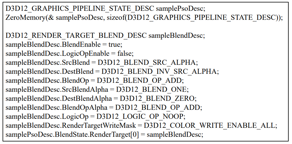 - Destination blend factor = D3D12_BLEND_INV_SRC_ALPHA