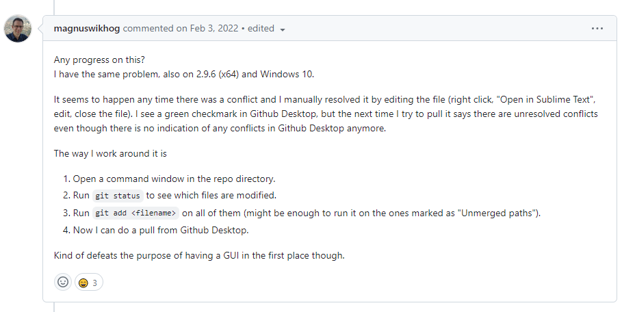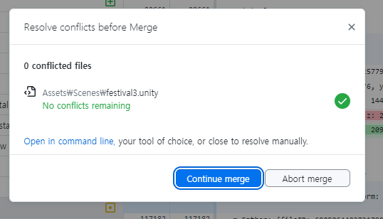 난 잘못한 게 없는데 continue merge를 누르면 'There are unresolved conflicts in the working directory.' 이 에러가 팝업창으로 계속 떴다.