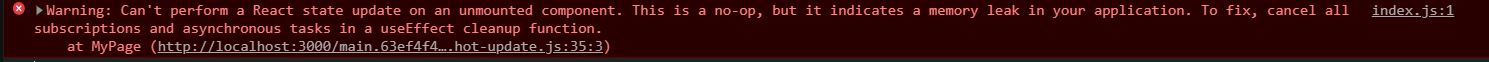 경고 : 마운트 해제 된 구성 요소에서는 React 상태 업데이트를 수행 할 수 없습니다. 이것은 작동하지 않지만 응용 프로그램의 메모리 누수를 나타냅니다. 수정하려면 useEffect 정리 함수에서 모든 구독 및 비동기 작업을 취소하십시오.