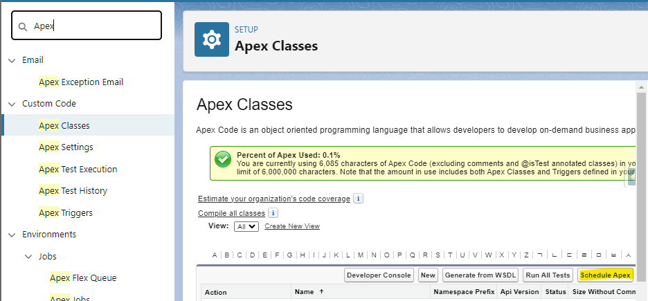 schedule은 스탠다드로도 구현이 가능하다. Setup에서 Apex Class의 Schedule Apex를 누르면 노코드 방식으로도 schedule 할 수 있다.
