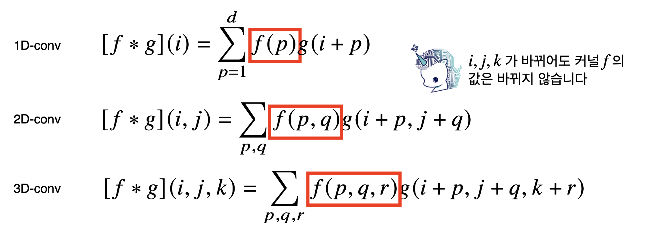예를 들면, 음성이나 텍스트 데이터는 1D-conv, 칼라 영상과 같은 데이터는 3D-conv를 사용하게 된다.