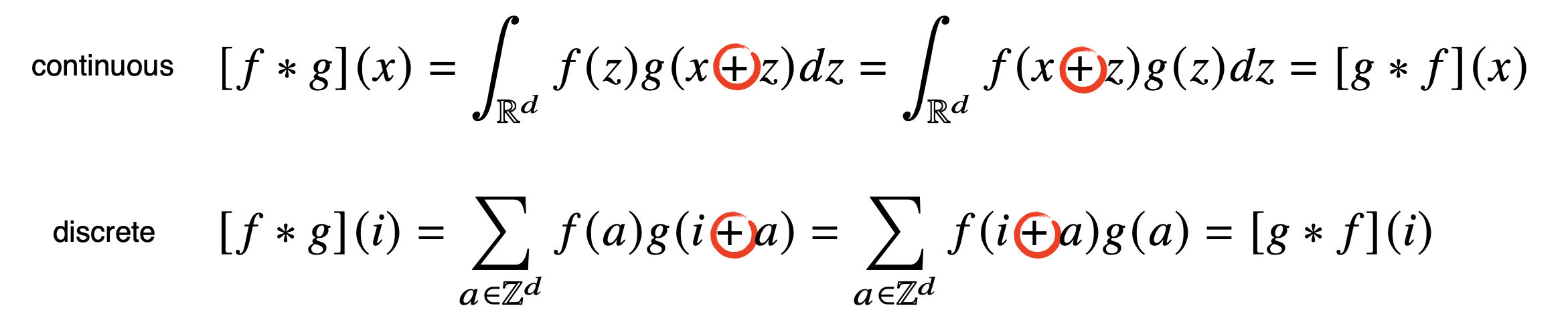 왜냐하면 아래 나와있는 것처럼 -가 아니라 + term이기 때문이다. 그래도 전체 공간에서는 +인지 -인지 중요하지 않다. 다만 컴퓨터에서는 convolution과 cross correlation은 차이가 크니 인지해두고 있자. 관용적으로는 ML분야에서 이 과정을 cross correlation이 아니라 convolution이라고 부르고 있다.