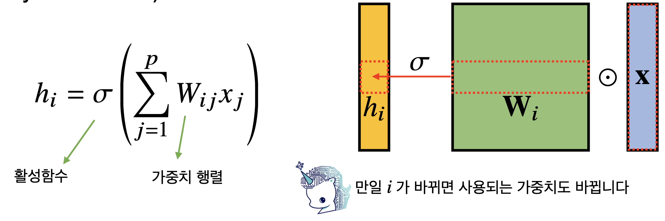 구조였다. 그러나 이것의 문제점은 각 성분 에 대응하는 가중치행 가 모든 성분에 대해 필요하다. 즉, 가중치 행렬의 사이즈가 너무 커진다