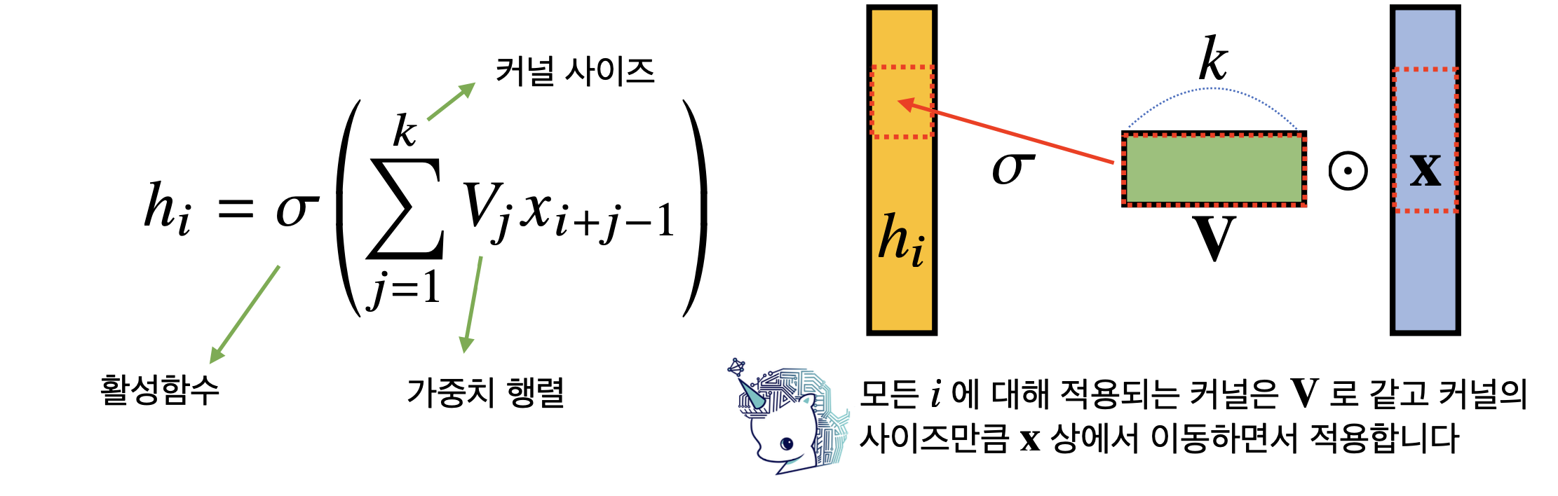 커널(kernel)이라는 고정된 벡터/행렬을 입력벡터 상에서 움직여가며 적용