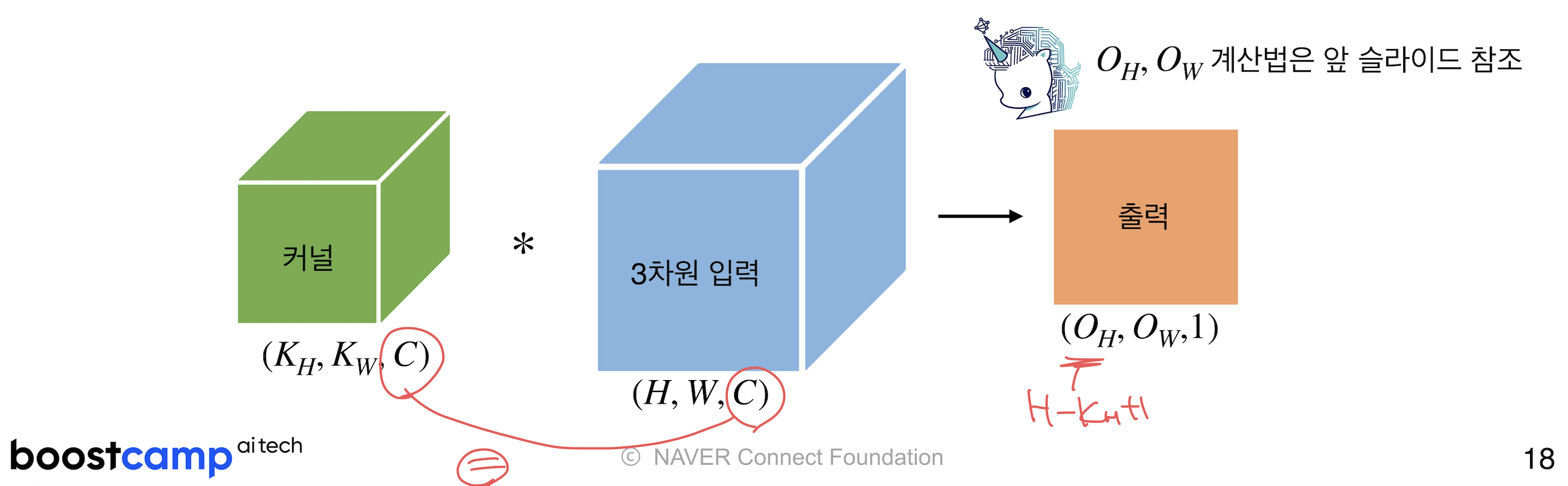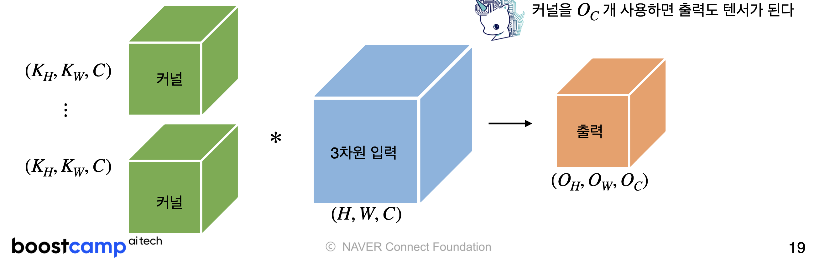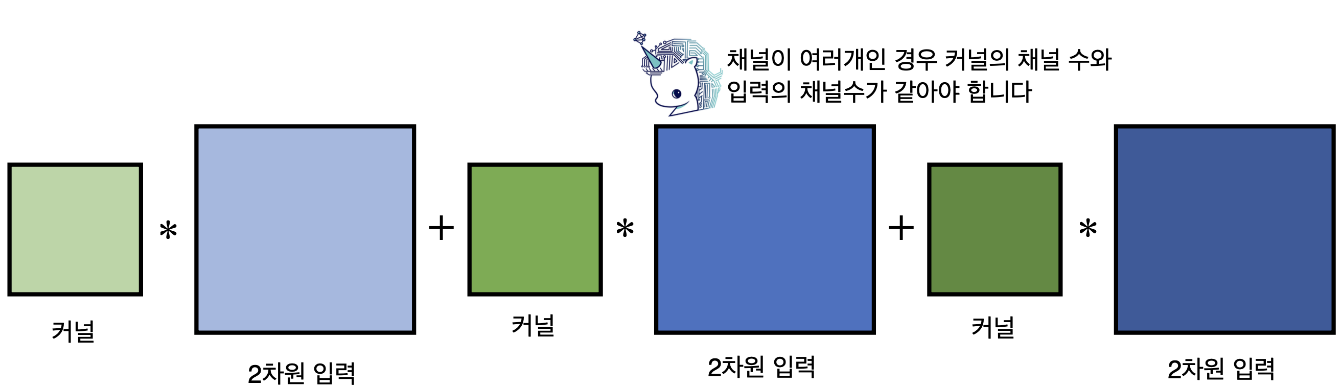 이를 직육면체 블록으로 표현하면서 출력벡터까지 보여주자면 다음과 같다. 아래 이미지에 나와있듯이, 커널과 입력벡터의 채널수는 같아야한다.