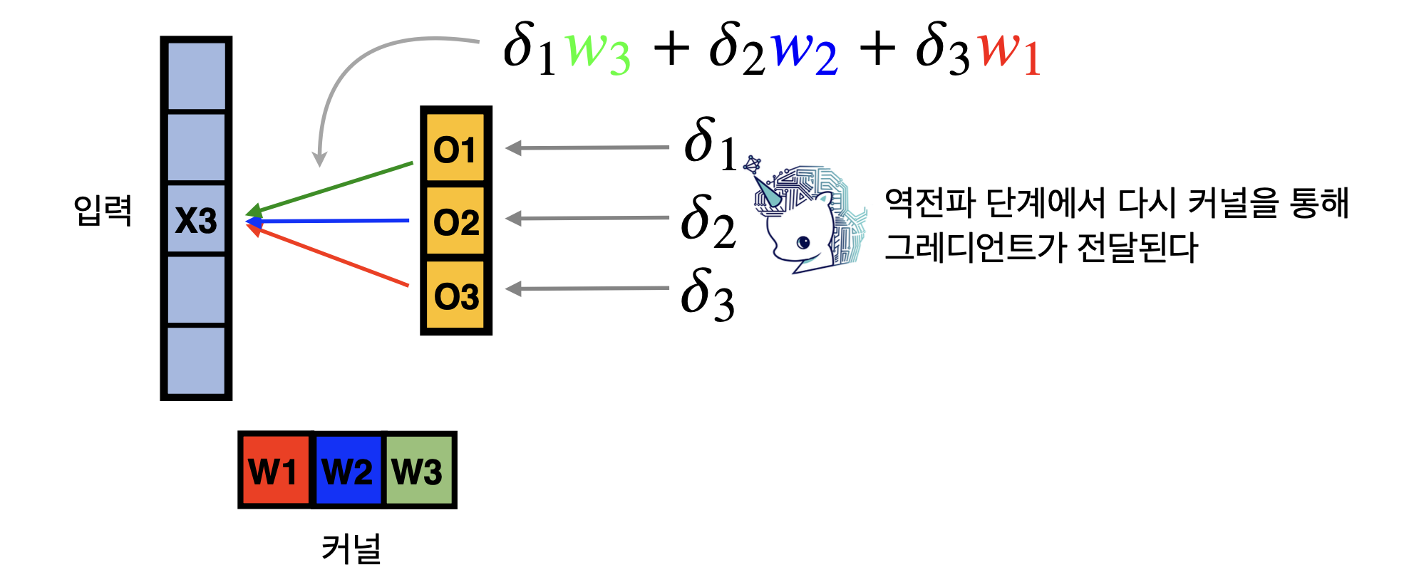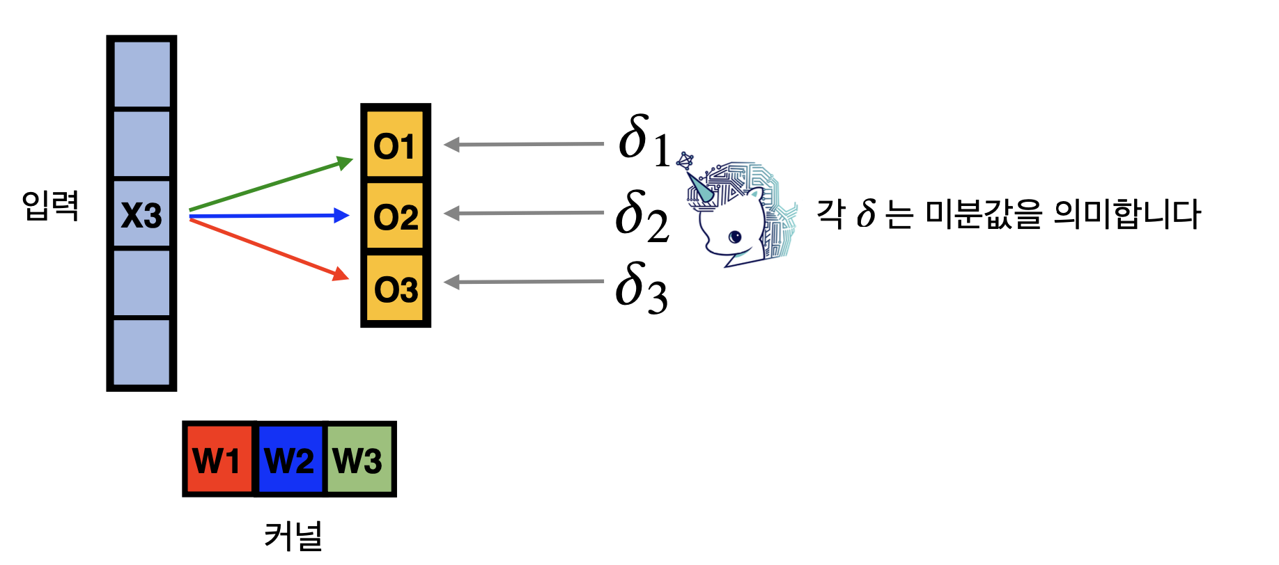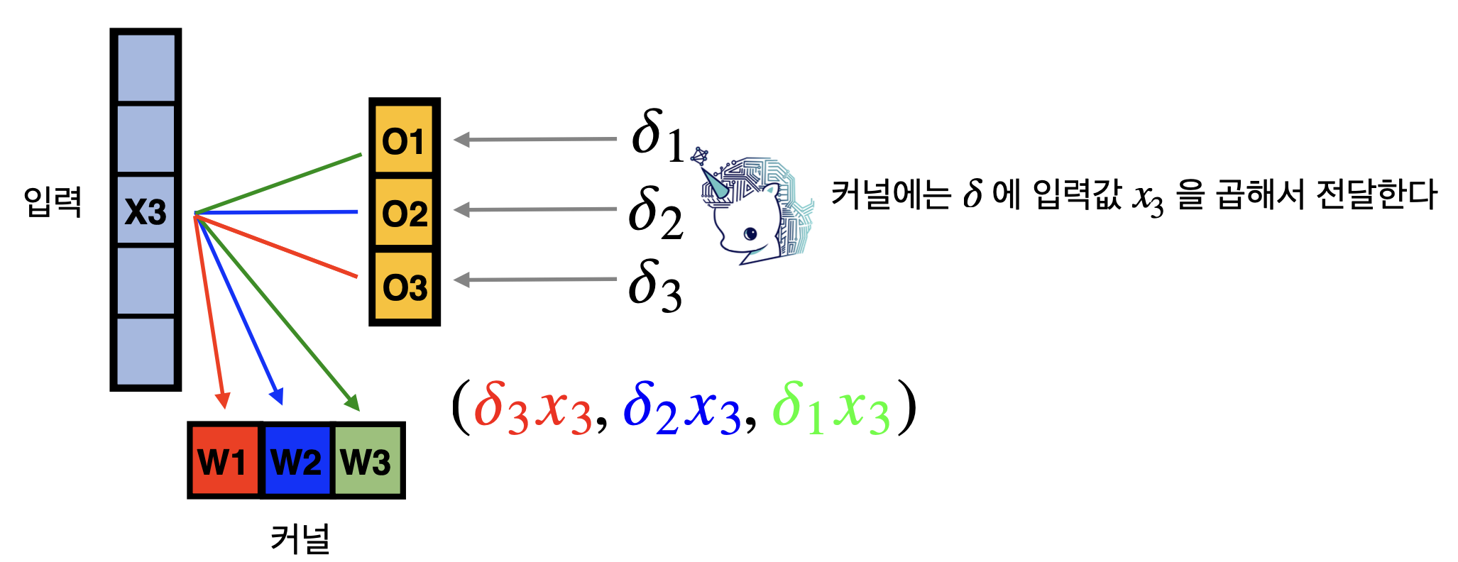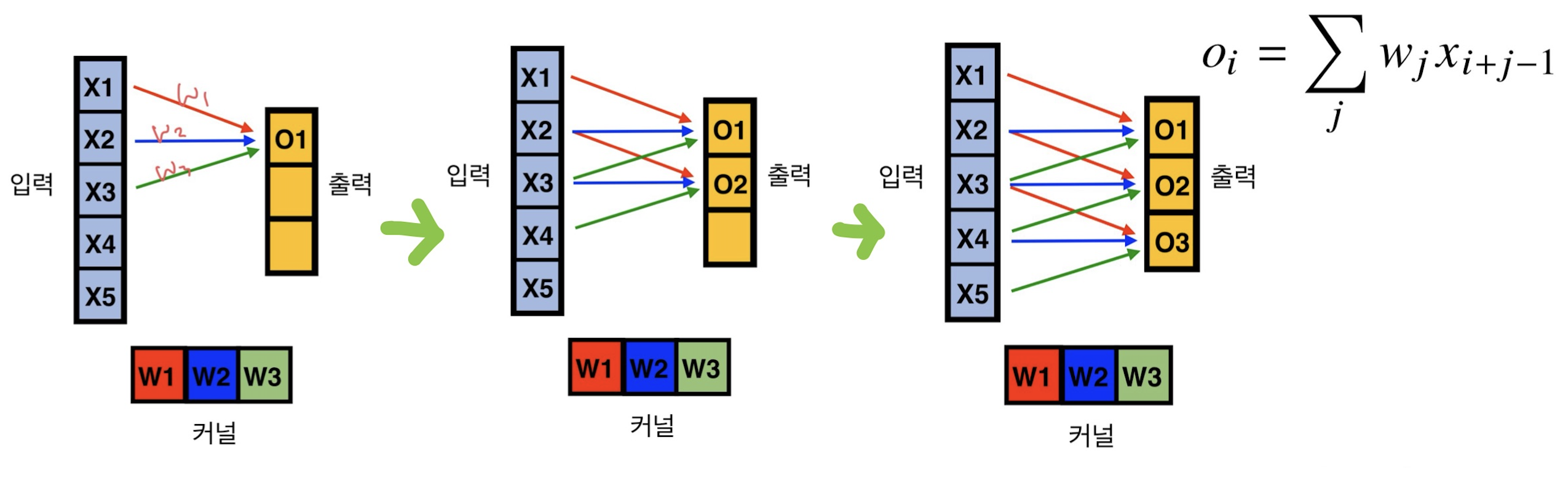 이동하면서 각각의 커널이 입력 x3 뿐만 아니라 다른 입력에서도 차례대로 적용되었기 때문에 다음과 같은 모양이 나온다.