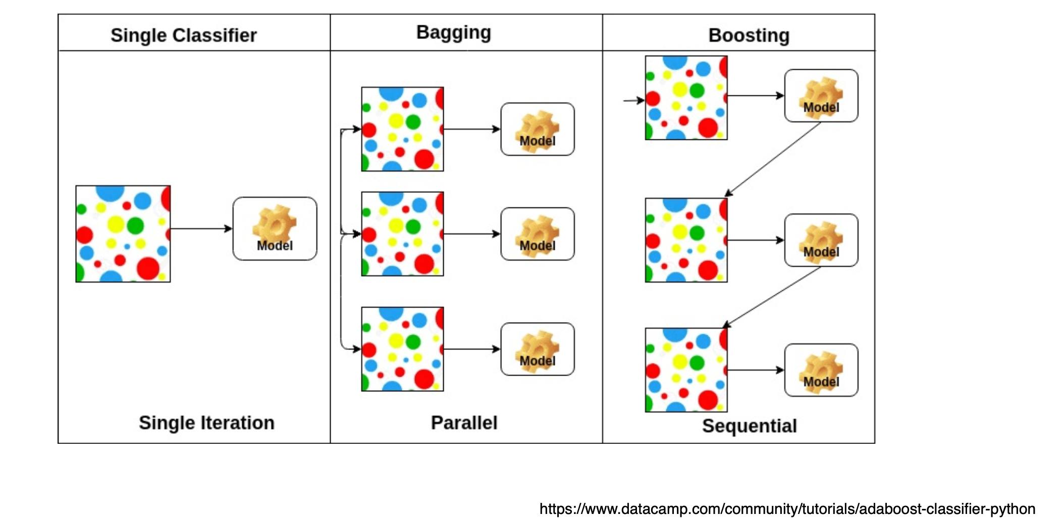 Boosting은 Weak Learners를 순차적으로 학습시키며, 각 단계에서 이전 단계의 모델이 잘못 예측한 데이터를 더 중점적으로 학습합니다. 이를 통해 학습기들은 점점 더 어려운 패턴을 학습하게 되며, 최종적으로 Strong Learner를 만듭니다.