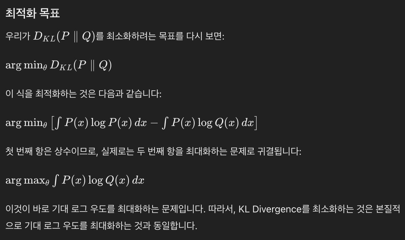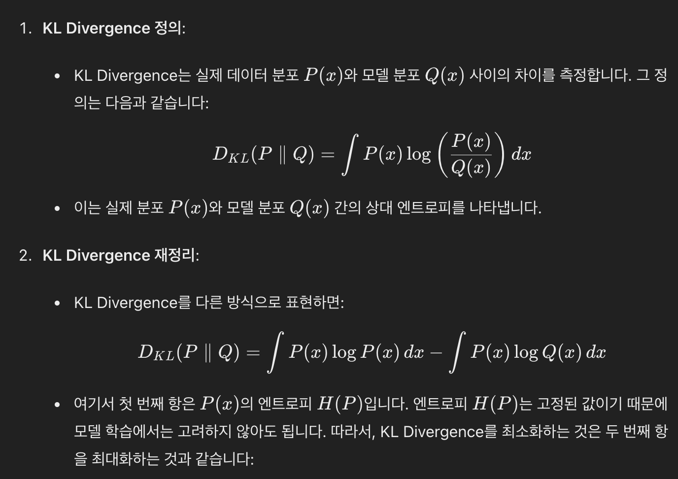 이 때 likelihood를 높이는 방향이란, 실제 데이터 분포와 모델 분포 간의 KL Divergence를 최소화하는 방향이다.