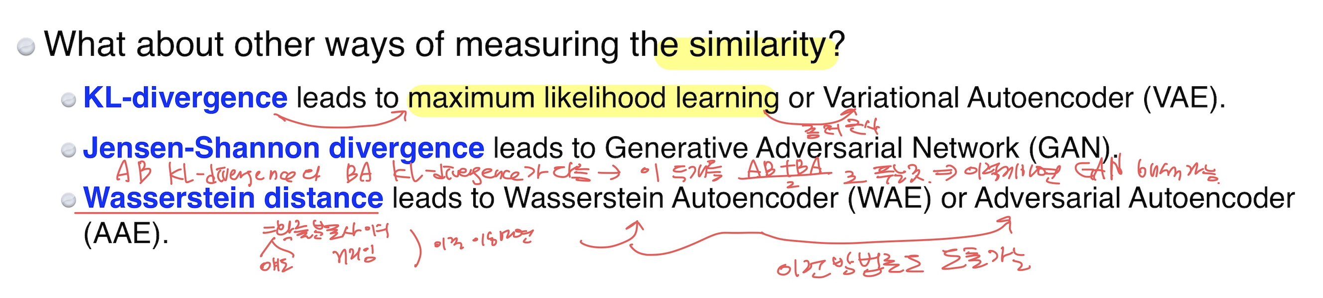 강아지 이미지를 생성하는 어떤 분포가 존재한다고 해보자. 우리는 그 분포를 모르지만 우리가 모델링할 수 있는 어떤 probability density를 어찌저찌 잘 조정해서 generative model과의 거리를 최소화하는 방향으로 해당 density를 최적화하고 싶을 것이다. 그러한 방식으로 최적의 강아지 이미지 생성 모델을 유추할 수 있을 것이기 때문이다.