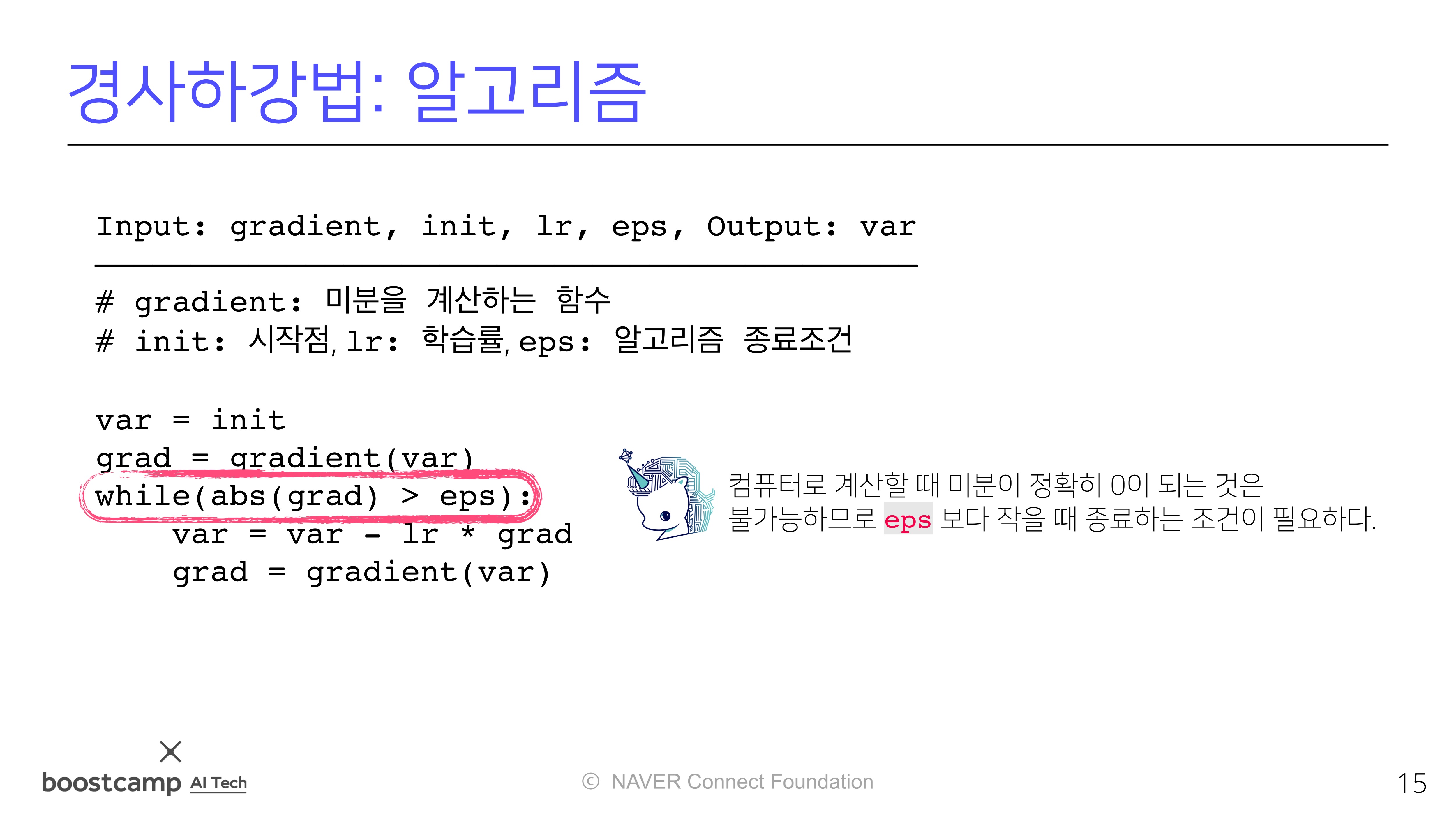 미분값을 빼면 함수의 극소값의 위치를 구할 수 있으며, 경사하강법(gradient descent)라고 함.