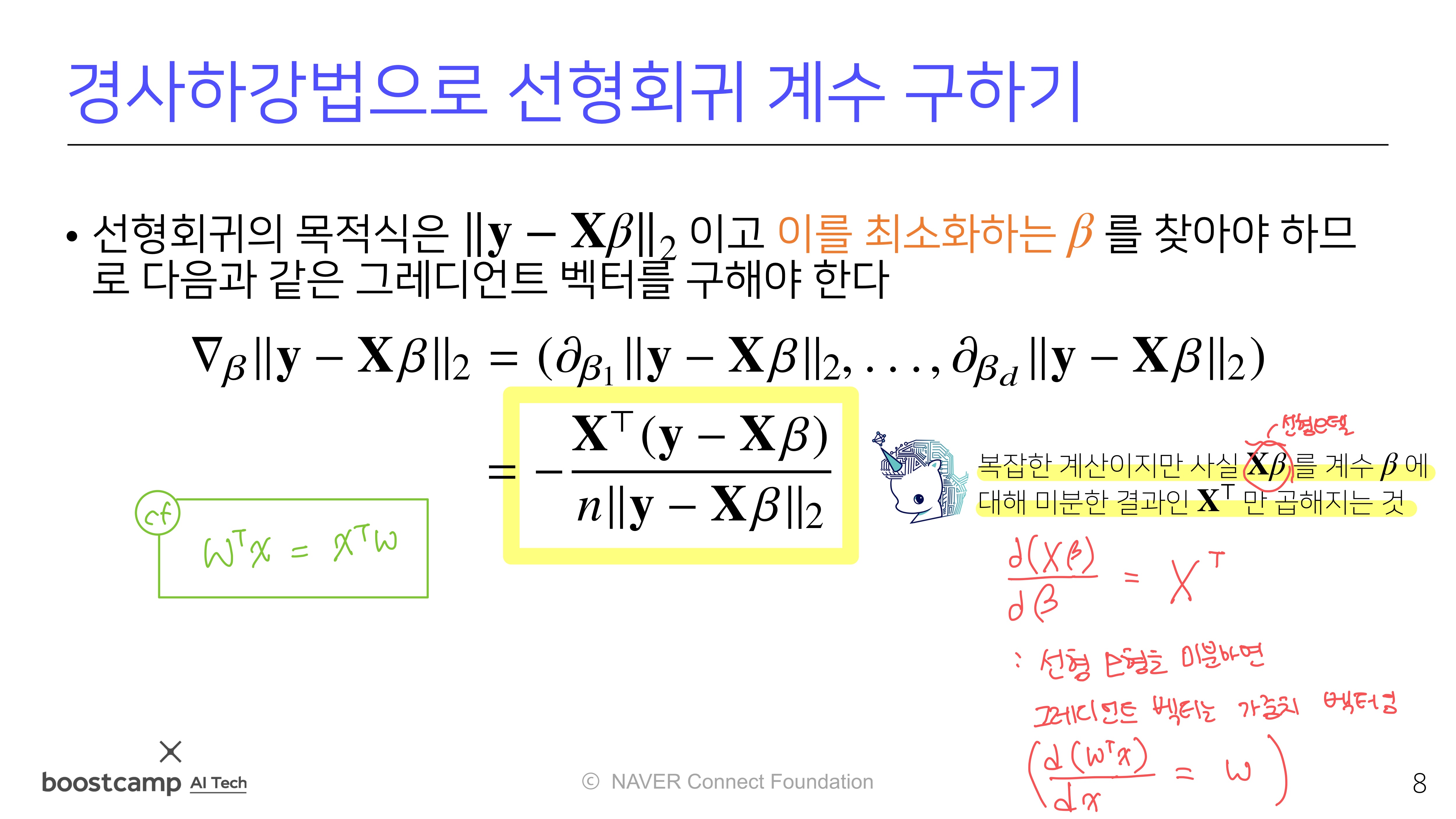 선형 모형을 편미분한 그레디언트 벡터의 결과는 가중치 벡터임