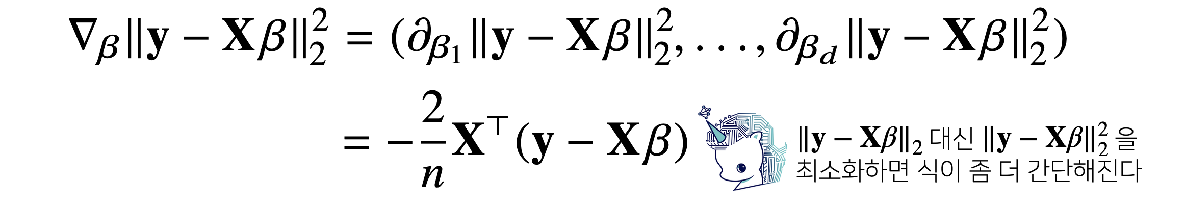 어차피 L2 Norm을 최소화하는 를 찾나, L2 Norm의 제곱을 최소화하는 를 찾나 둘 다 동일! 그런데 제곱을 활용하면 식이 더 간편해지니 이렇게 사용함