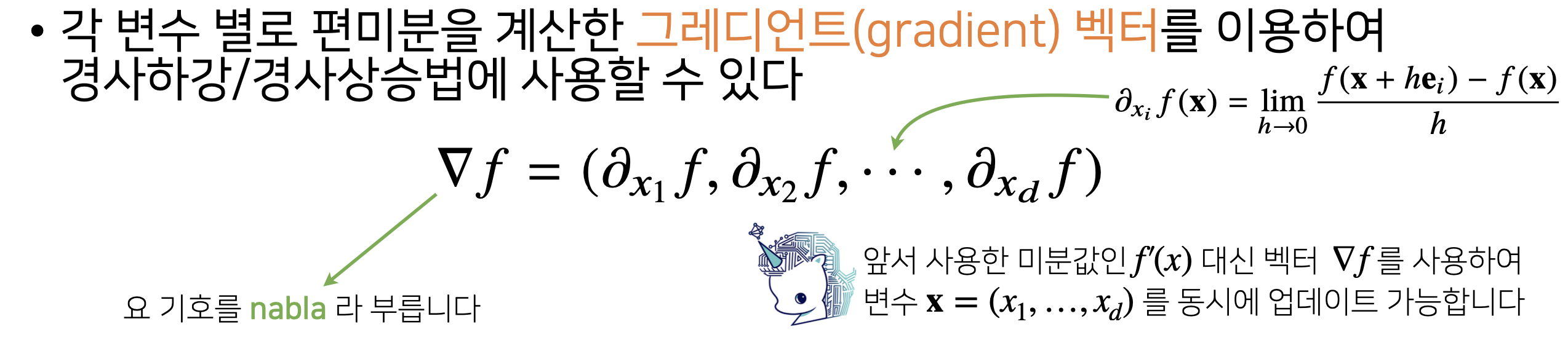 각 변수 별로 편미분을 계산한 그레디언트(gradient) 벡터 이용d차원의 vector이면 편미분을 d번 수행