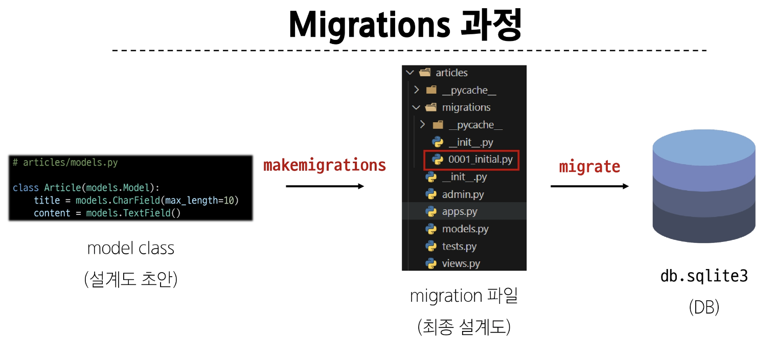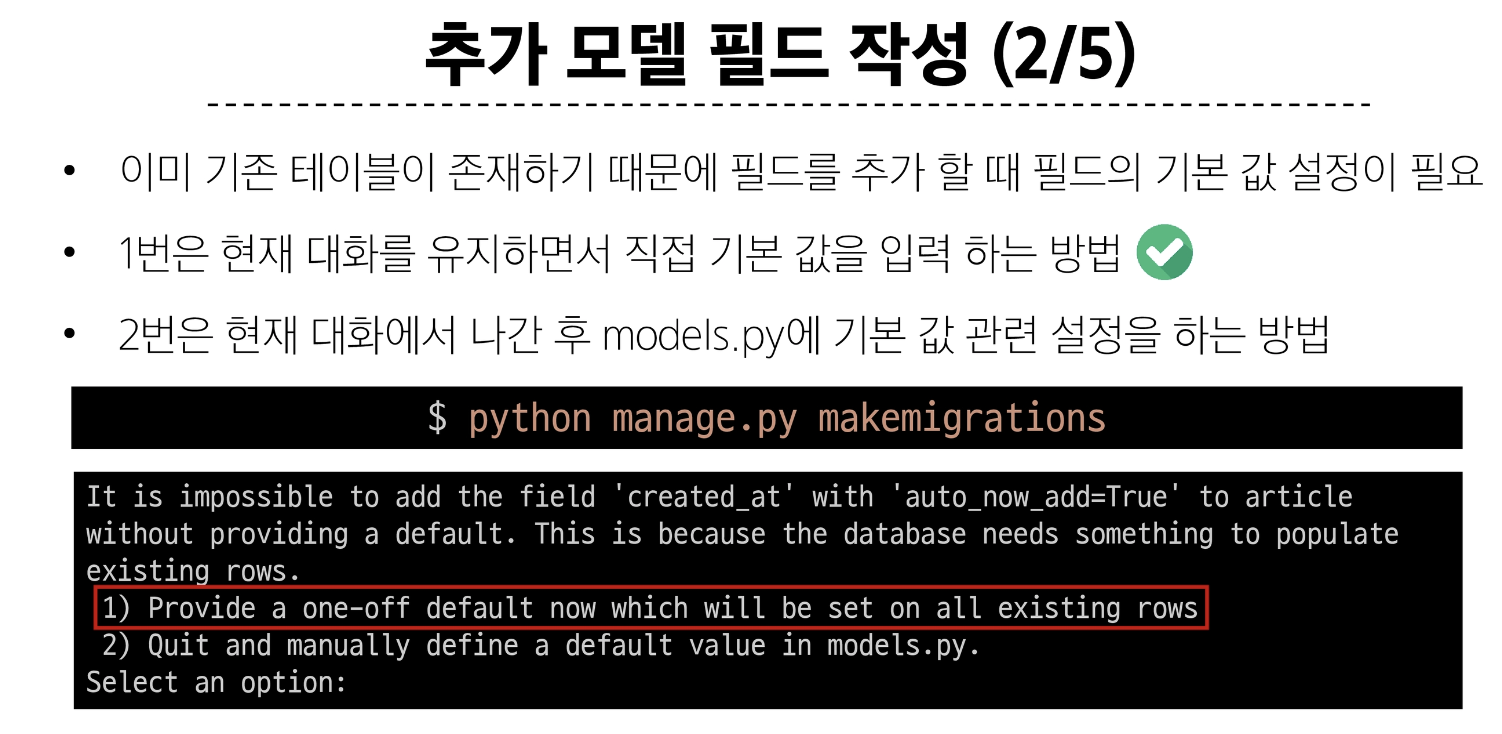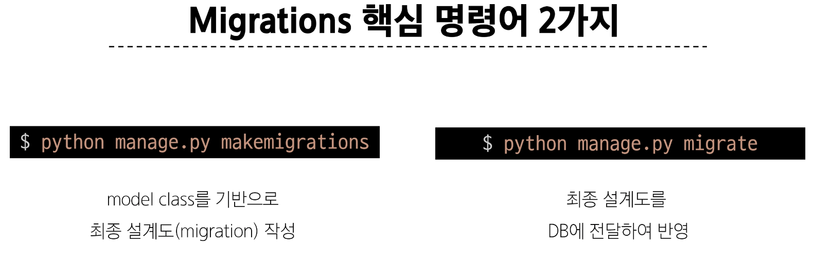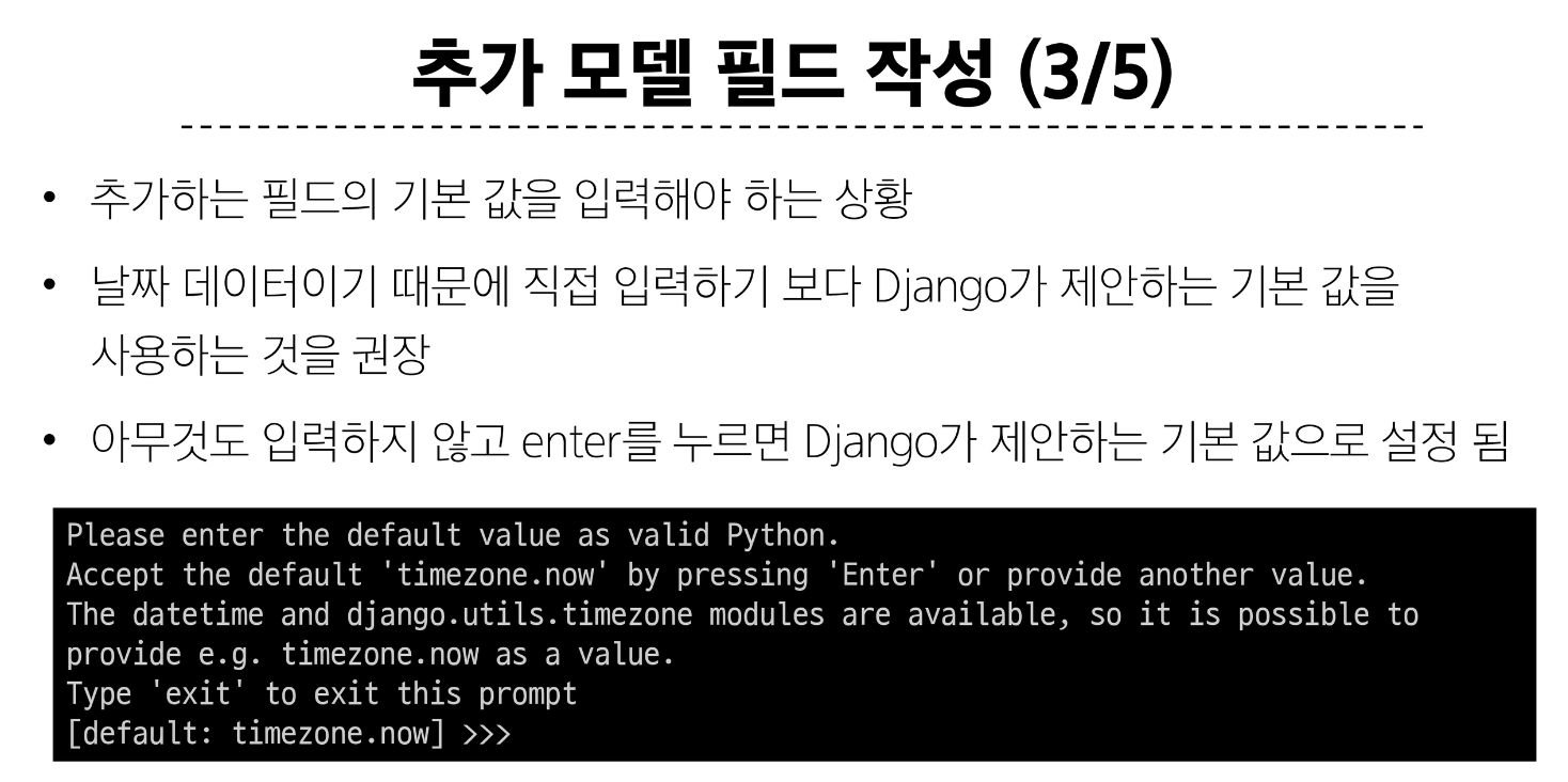 - model class 변경 -> 2. makemigrations -> 3. migrate