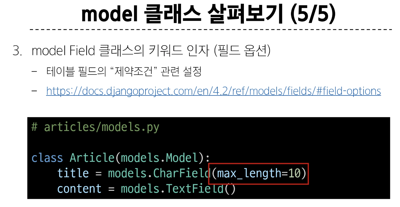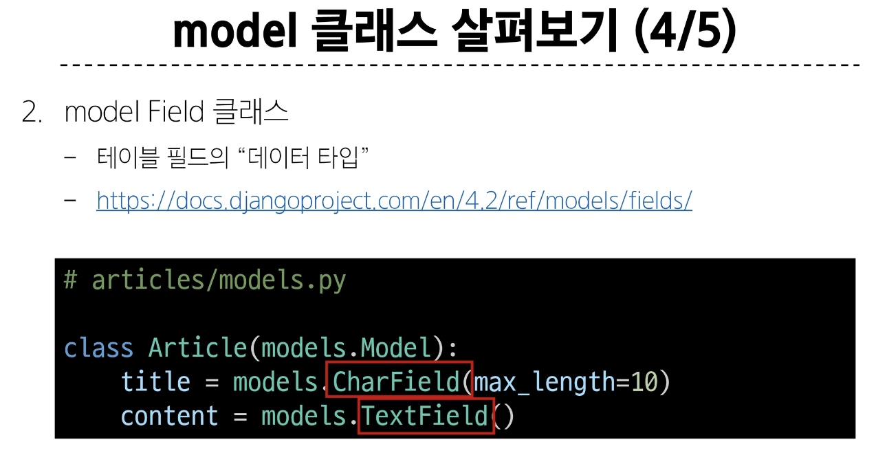 - CharField(): 길이의 제한이 있는 문자열을 넣을 때 사용 (필드의 최대 길이를 결정하는 max_length는 필수 인자)
