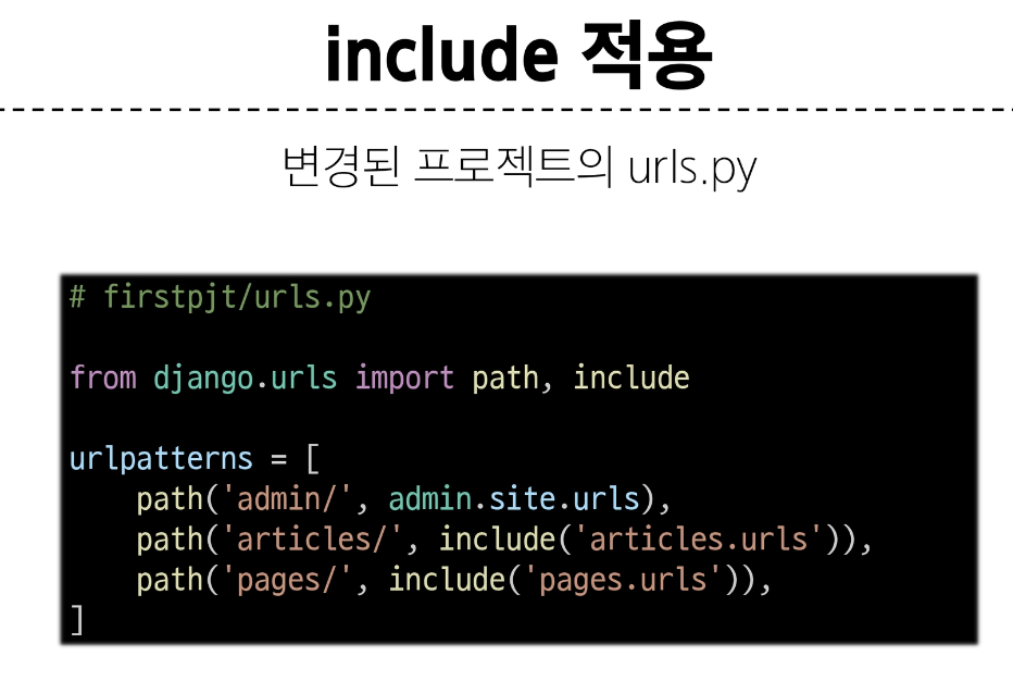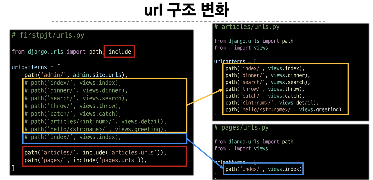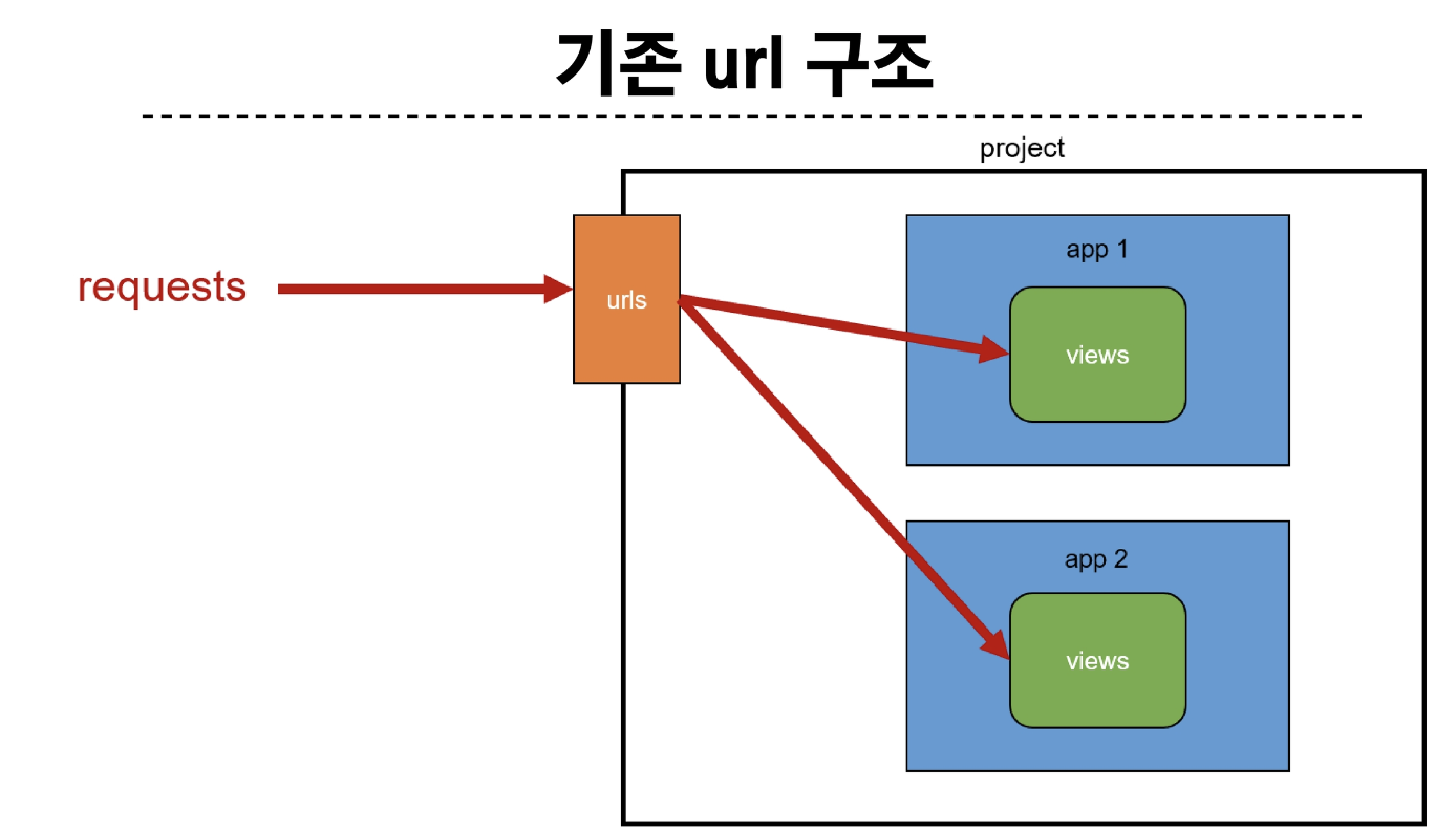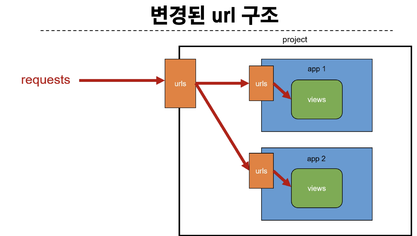 : 각 앱에 URL을 정의하는 것 => 프로젝트와 각 앱이 URL을 나누어 관리를 편하게 하기 위함