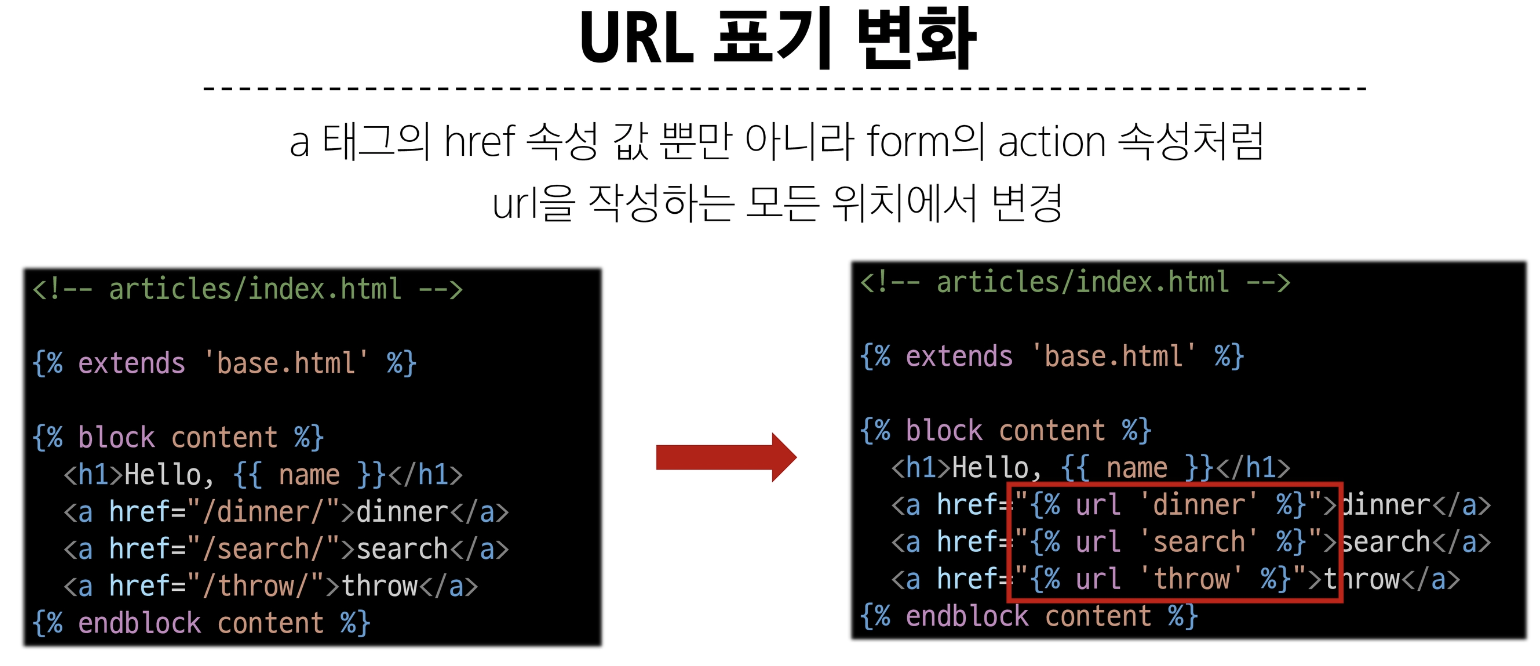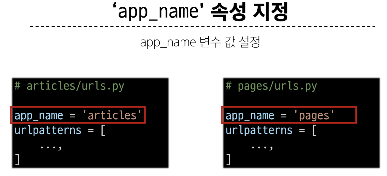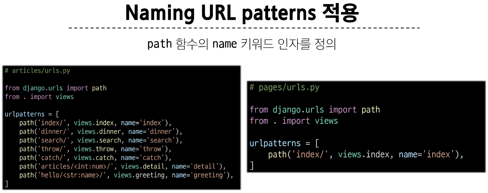 : URL에 이름을 지정하는 것 (path 함수의 name 인자를 정의해서 사용)