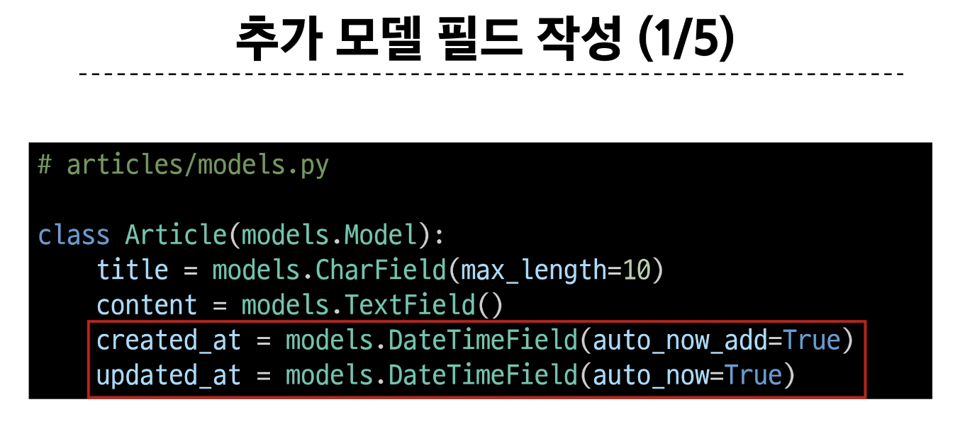 - auto_now_add: 데이터가 처음 생성될 때만 자동으로 현재 날짜시간을 저장