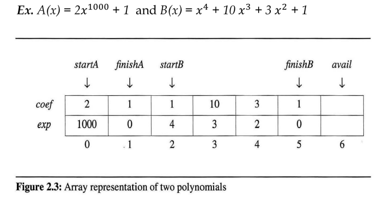 #define MAX_TERMS 100 typedef struct { float coef; int expon; } polynomial; polynomial terms[MAX_TERMS]; int avail = 0; int starta, finisha;