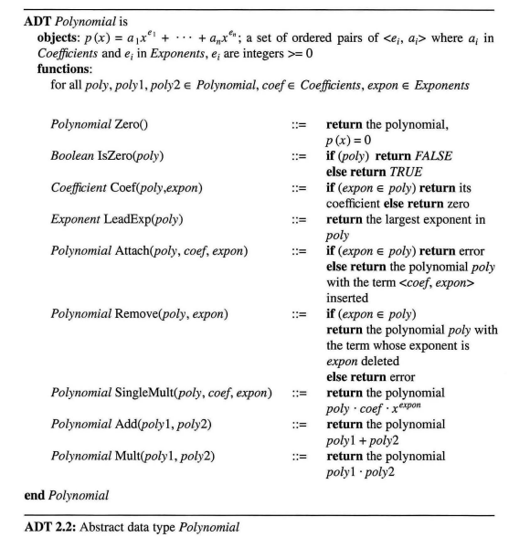 #define MAX_DEGREE 101 // 최고차항 차수 + 1 typedef struct { int degree; float coef[MAX_DEGREE]; } polynomial; polynomial a; a.degree = n a.coef[i] = an-i, o<=i<=n-> 메모리 낭비 큼.