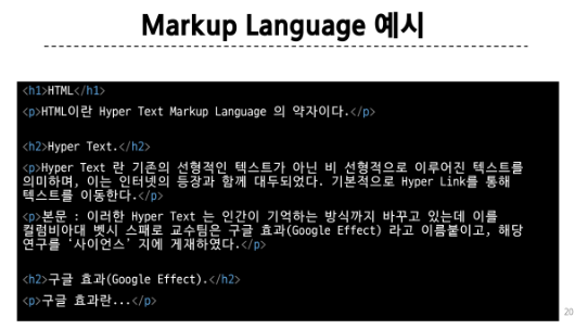 - Markup Language: 태그 등을 이용하여 문서나 데이터의 구조를 명시하는 언어 ex) HTML, Markdown