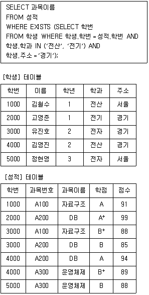 EXISTS는 서브쿼리의 결과값에 만족하는 값이 메인쿼리에 있는지 없는지 데이터의 존재유무를 확인하는 조건식이다.