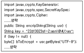 소프 코드 내부에 암호화 키를 상수 형태로 하드코딩하여 사용하면 악의적인 공격자에게 암호화 키가 노출될 위험이 있음