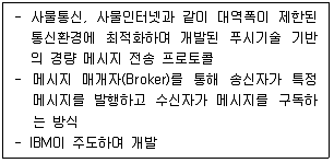MQTT : 사물통신, 사물 인터넷과 같이 대역폭이 제한된 통신 환경에 최적화하여 개발된 푸시기술 기반의 경량 메시지 전송 프로토콜이다.