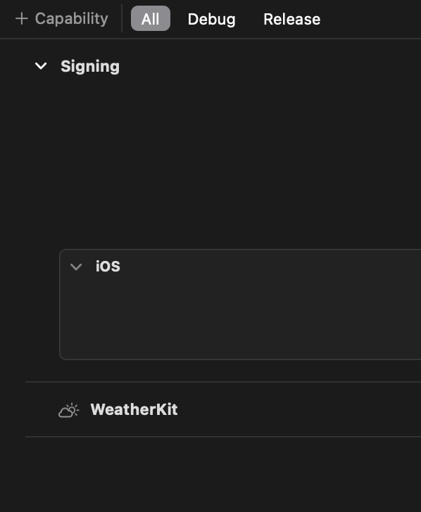 난 weatherKit을 사용 해보려 했었고 weatherKit의 사용 순서를 통해 아래의 사진 처럼 빌드 타겟 셋팅에서 Capability에서 weatherKit을 추가 했다. 그러니 .entitlements이 생성 되었다.