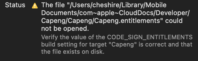 파일을 삭제하고 실행을 하면 이런 경고가 뜬다. 이 경고는 한국어론 이 프로젝트 파일이 .entitlements 파일을 참고 있다는 뜻이었다.