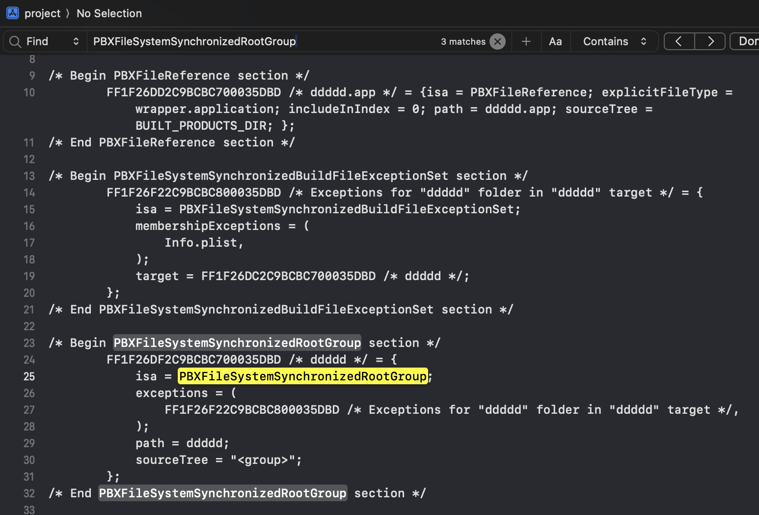모든 PBXFileSystemSynchronizedRootGroup을 PBXGroup으로 변경한다.