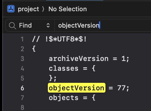 objectVersion이 63인지 확인하고, 아니라면 63으로 수정한다.