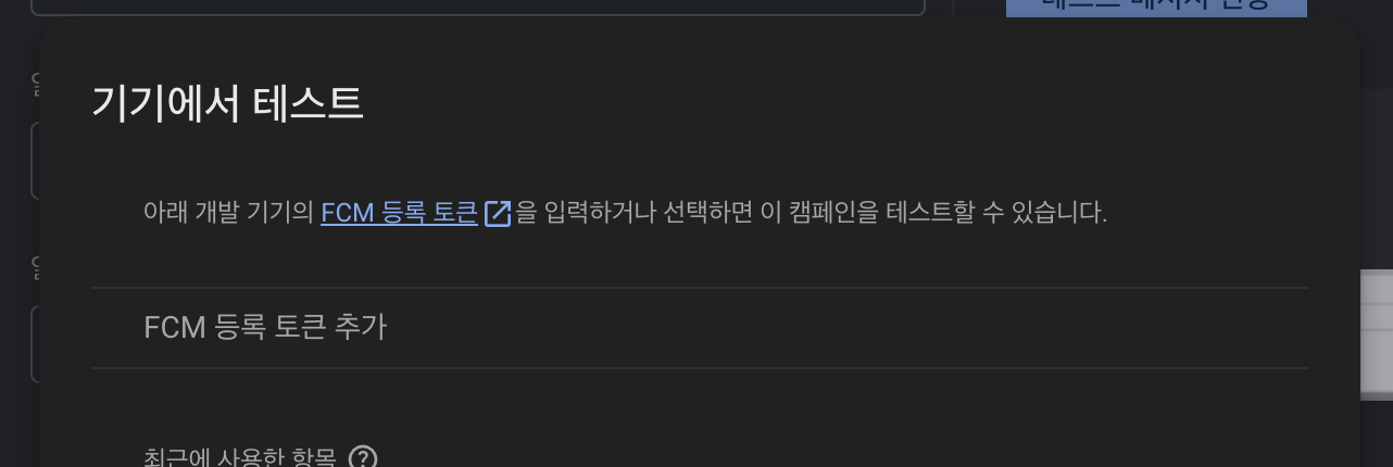 ※ 위 화면에서 "FCM 등록 토큰 추가" 텍스트를 터치하면 되는데, 다소 직관적이지 않은 UI임을 경험하였다.