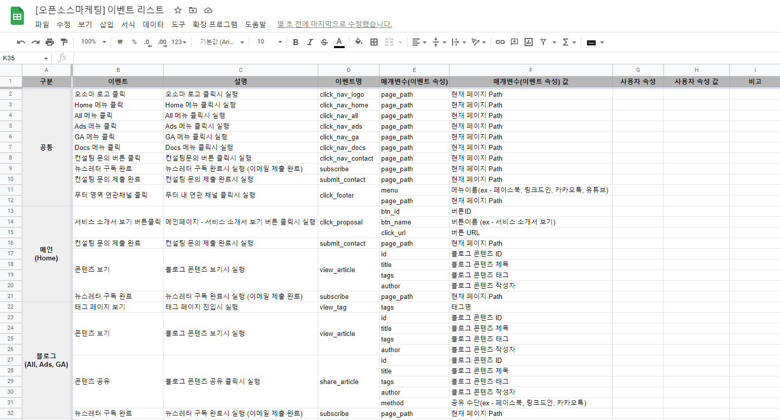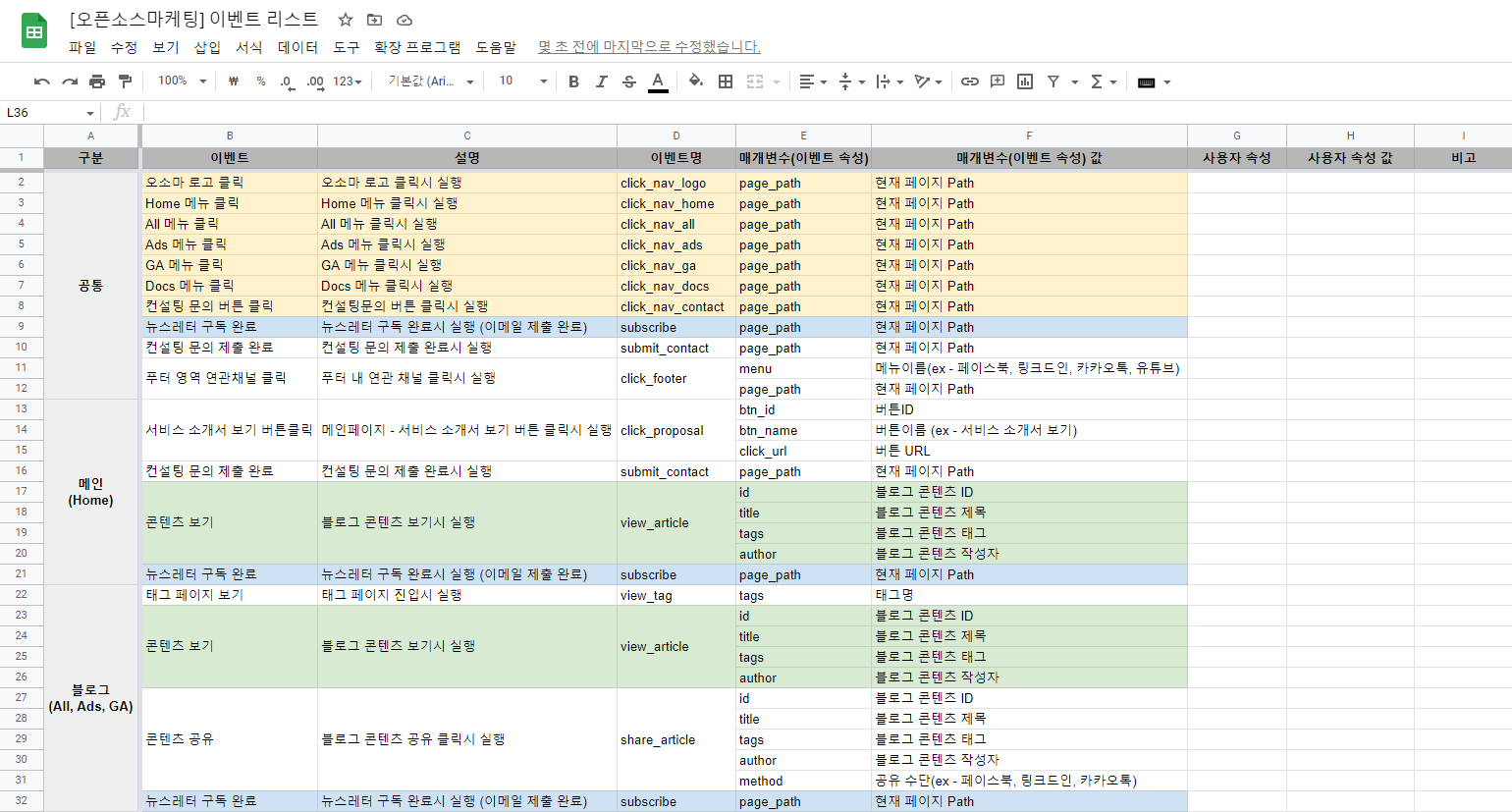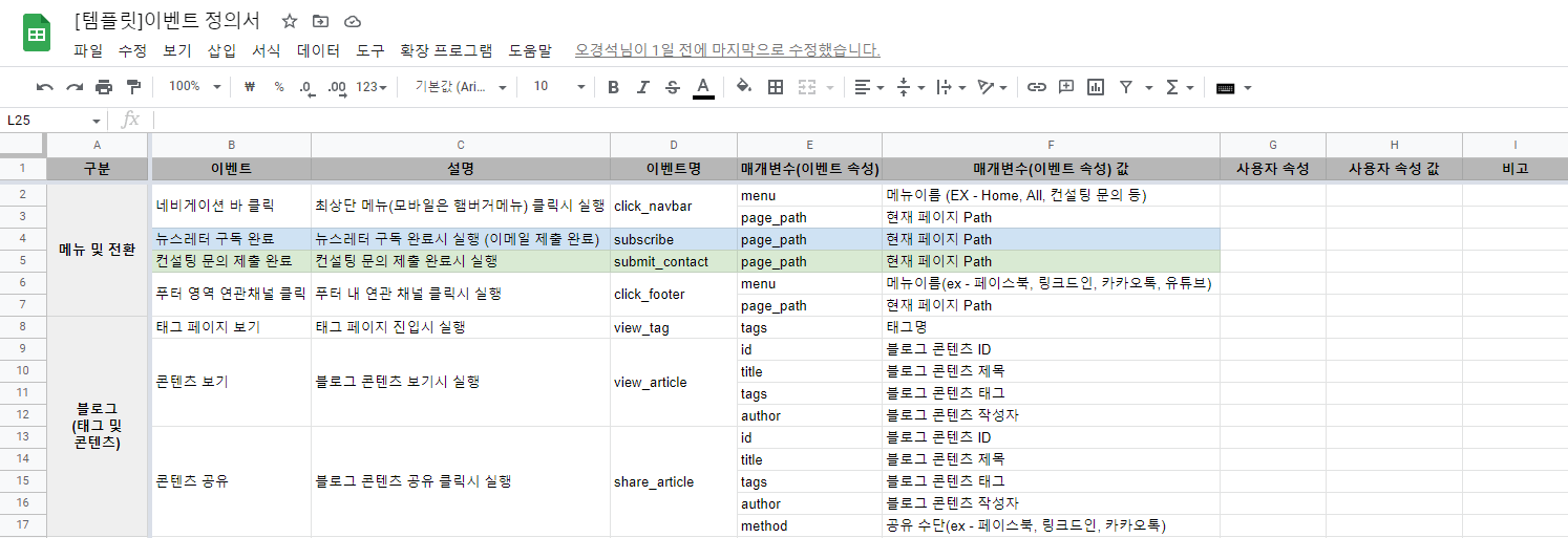 서비스 화면 기준으로 이벤트/매개변수 파악이 끝나면 각 데이터를 리스트로 정리하여 이벤트 정의서 초안을 만듭니다.