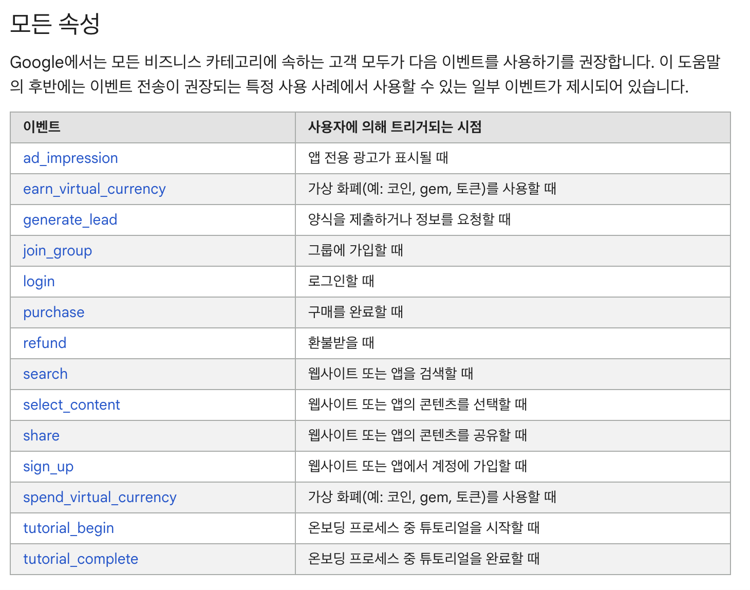GA의 추천 이벤트 (모든 속성_토큰사용 포함)