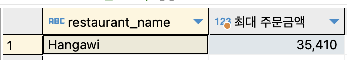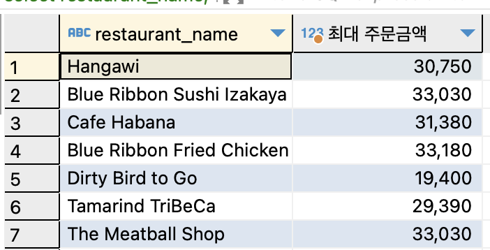 최대 주문 금액 1건만 나오게 된다. 그런데 group by를 구하면 전체 컬럼을 불러올 수 있다.
