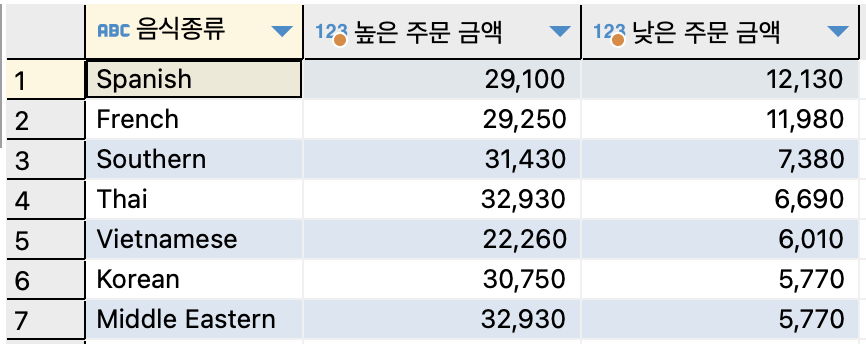 음식 종류별 가장 높은 주문 금액과 가장 낮은 주문금액을 조회하고, 가장 낮은 주문금액 순으로 (내림차순) 정렬하기