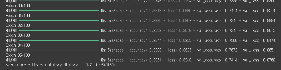 100번 epoch중 35번 째 epoch에서 학습을 멈췄습니다.