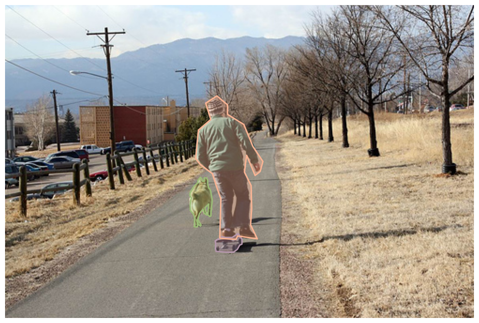 showAnns 메서드는 위에서 coco.loadAnns 메서드에서 구한 annotation 상세 정보를 인자로 넣어주면 자동으로 그림을 그려줍니다.